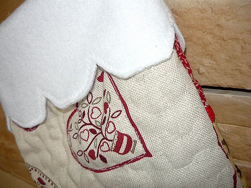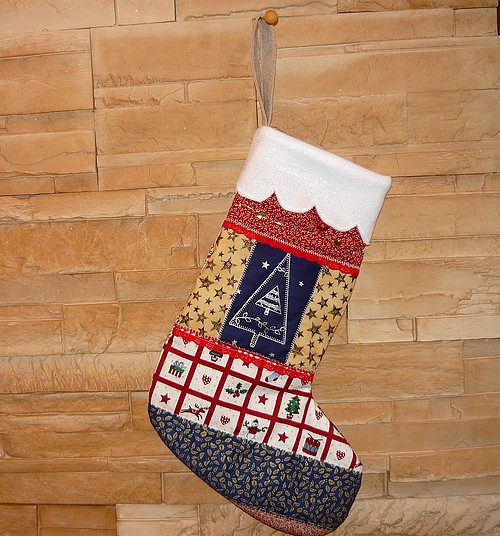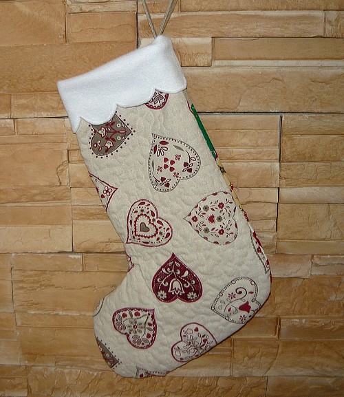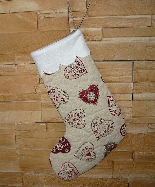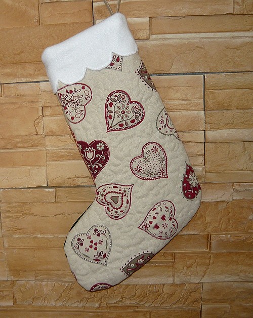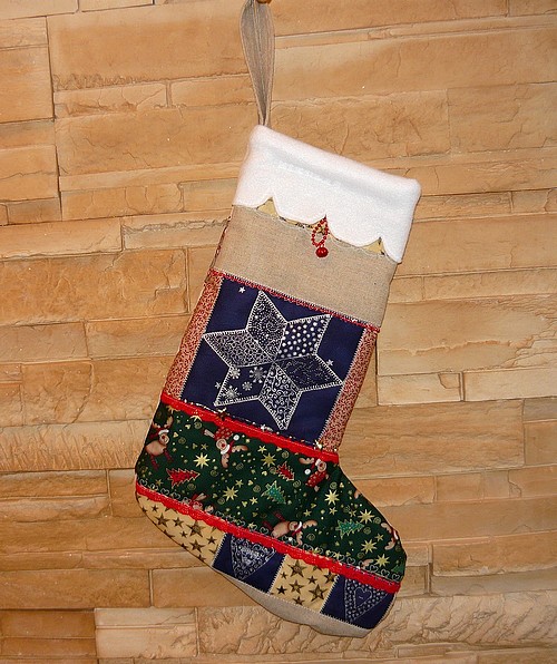 Mikulášská ponožka je velká a prostorná, sešitá s bavlněných a režných látek, vatelínu a podšívky