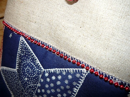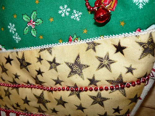 Spojené pásky prošité ozdobným stehem, všitou dekorací s perly, hvězdičky a rolničkou, z druhé strany ozdobný quilt, srdíčka obšitá stříbrnou metalickou nití